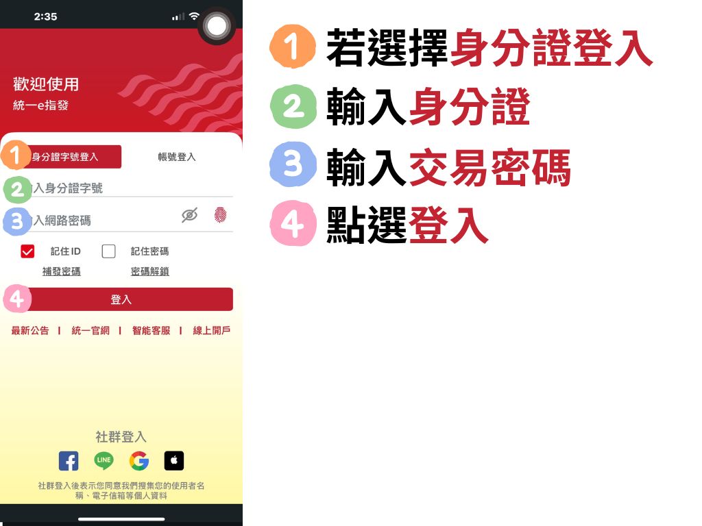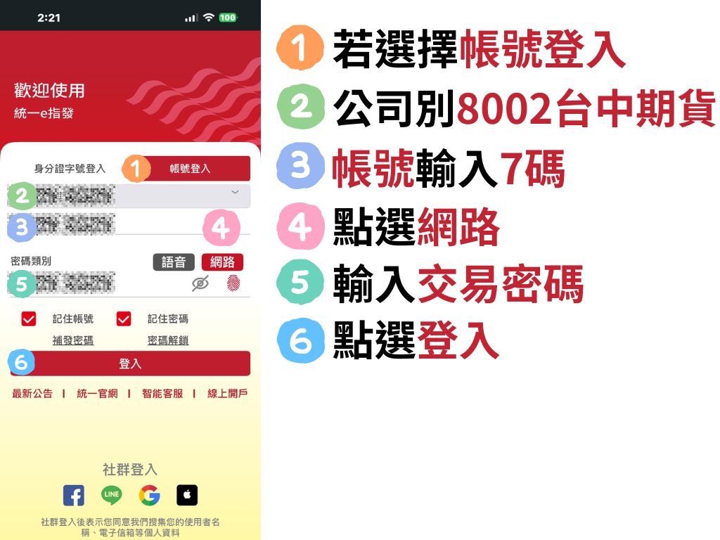 第一次登入統一e指發,仍需選擇分公司別,輸入7位期貨帳號及密碼後才能進行登入,可選擇是否記憶帳號。
