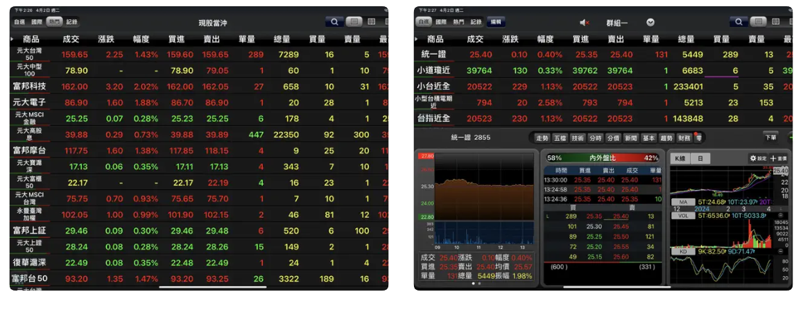 橫置時,資訊視窗可觀看三項功能。畫面如下:(還可再切換為兩列報價)