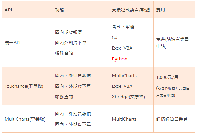 👉 亮點:統一 API 是目前唯一支援 Python 的選項,對想快速切入程式交易的朋友相當友好!