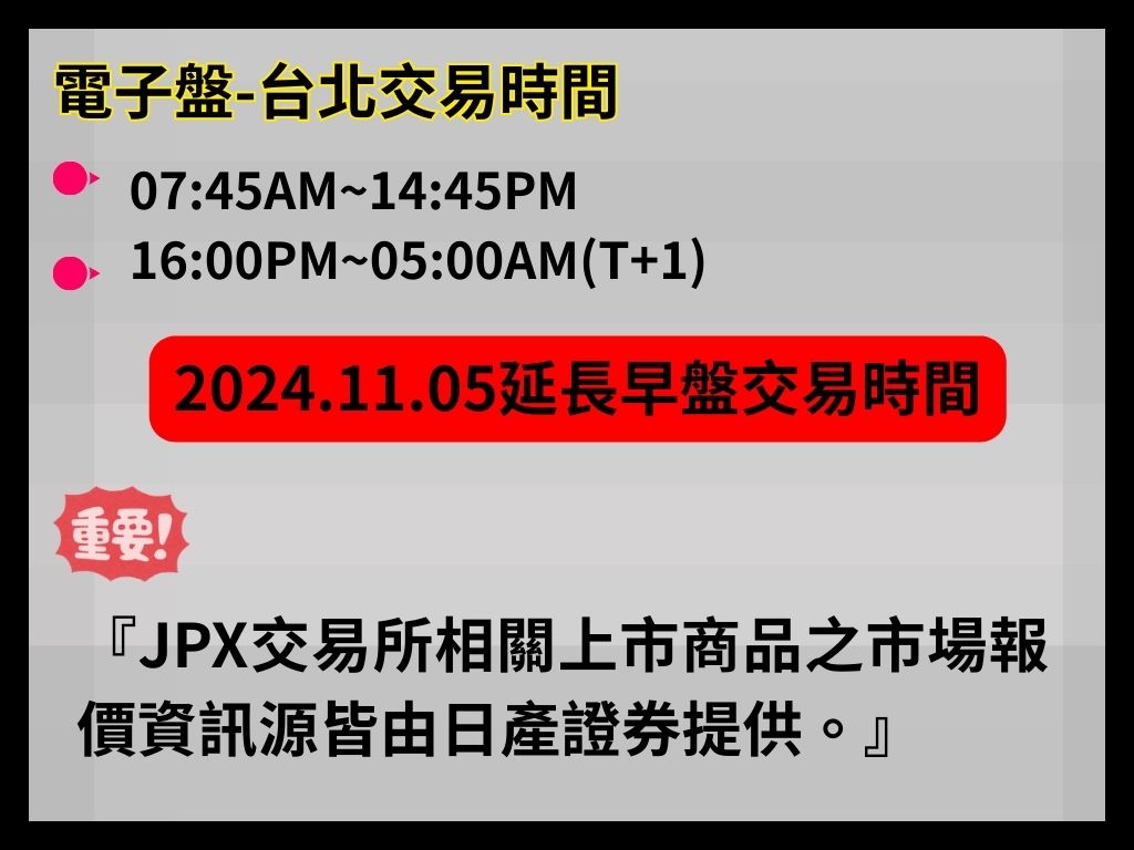 說明:2024/11/05 起 JPX 調整衍生品整體時段,上述為換算成台灣時間後之區間。jpx.co.jp+1