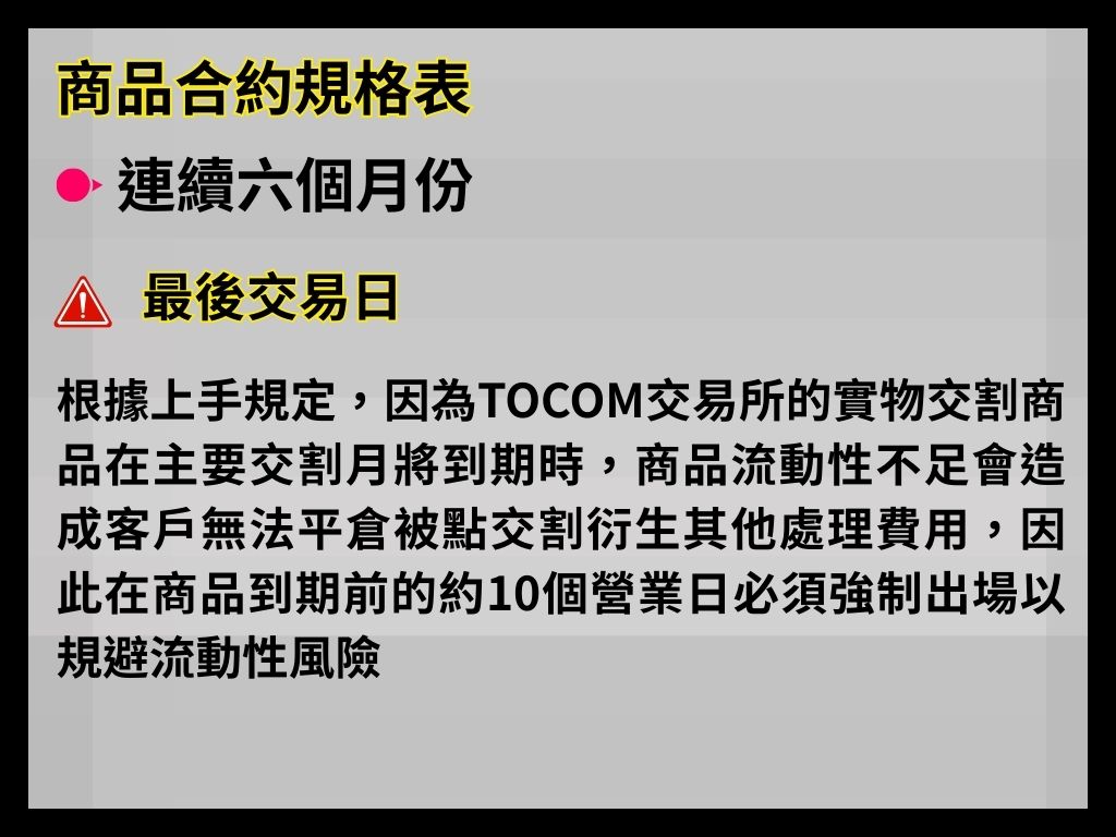 避開交割:本商品為實物交割;若你不打算參與交割,務必留意 LTD=前月25日(日盤) 前平倉,並遵循你券商的強平&展期規範。jpx.co.jp
