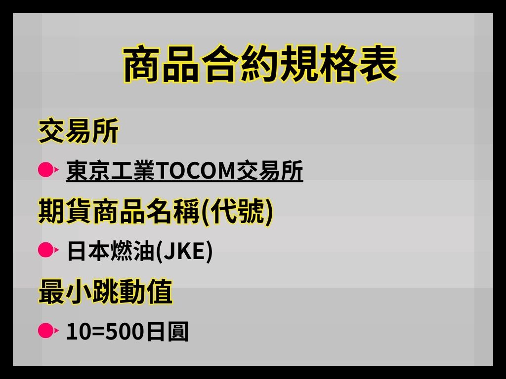 - 商品:Kerosene Futures(日本燃油/煤油),JIS K2203 Grade 1 規格。