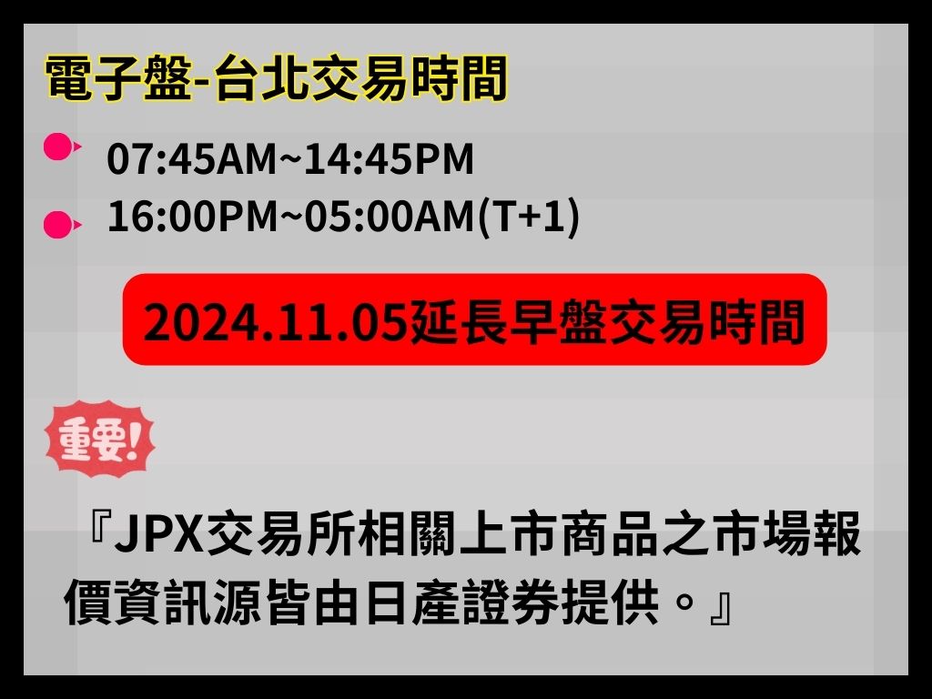 A:JPX 公告以 JST 8:45–15:45、17:00–06:00 表示;本文已換算成台灣時間 07:45–14:45、16:00–05:00,並標註 2024/11/05 之時段調整。