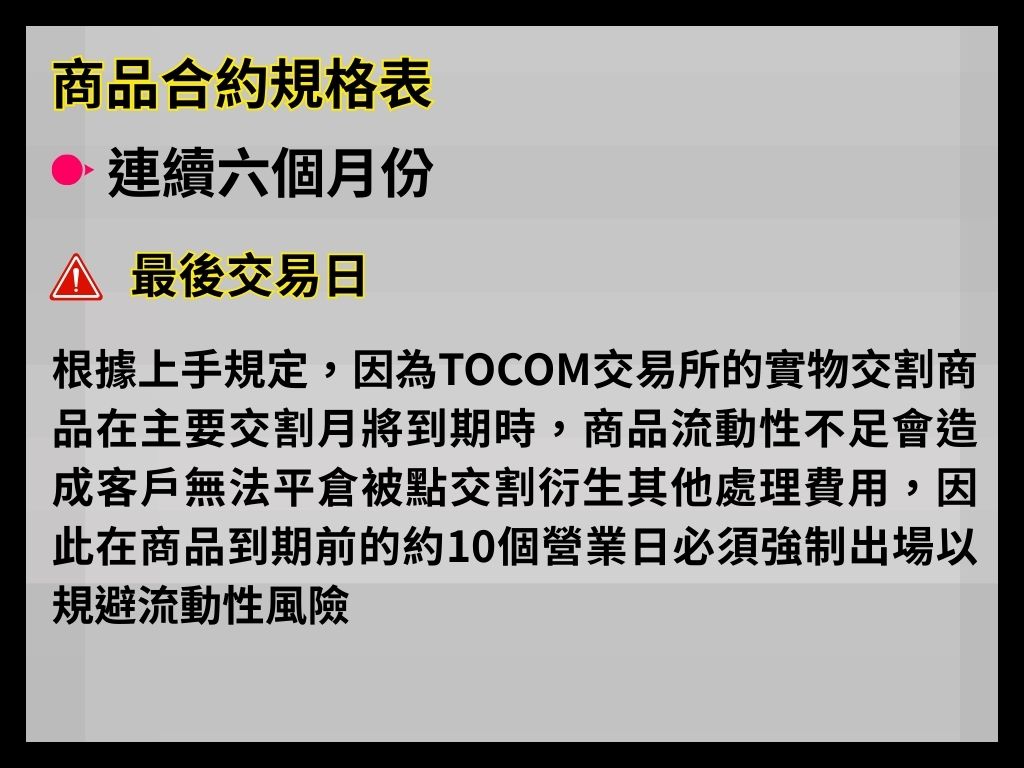 - 最後交易日(LTD):交割月前一個月的 25 日「日盤」。