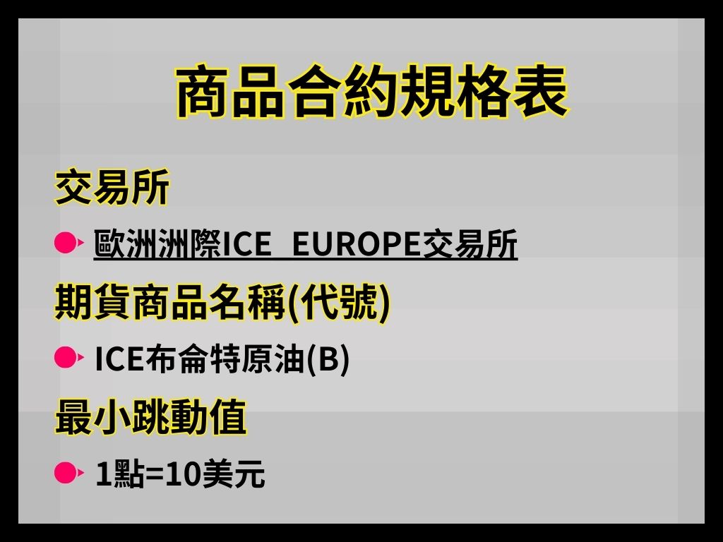 ICE 布侖特原油(B)|每跳 $10、掛月 96 個月、台灣時間 08:00–06:00