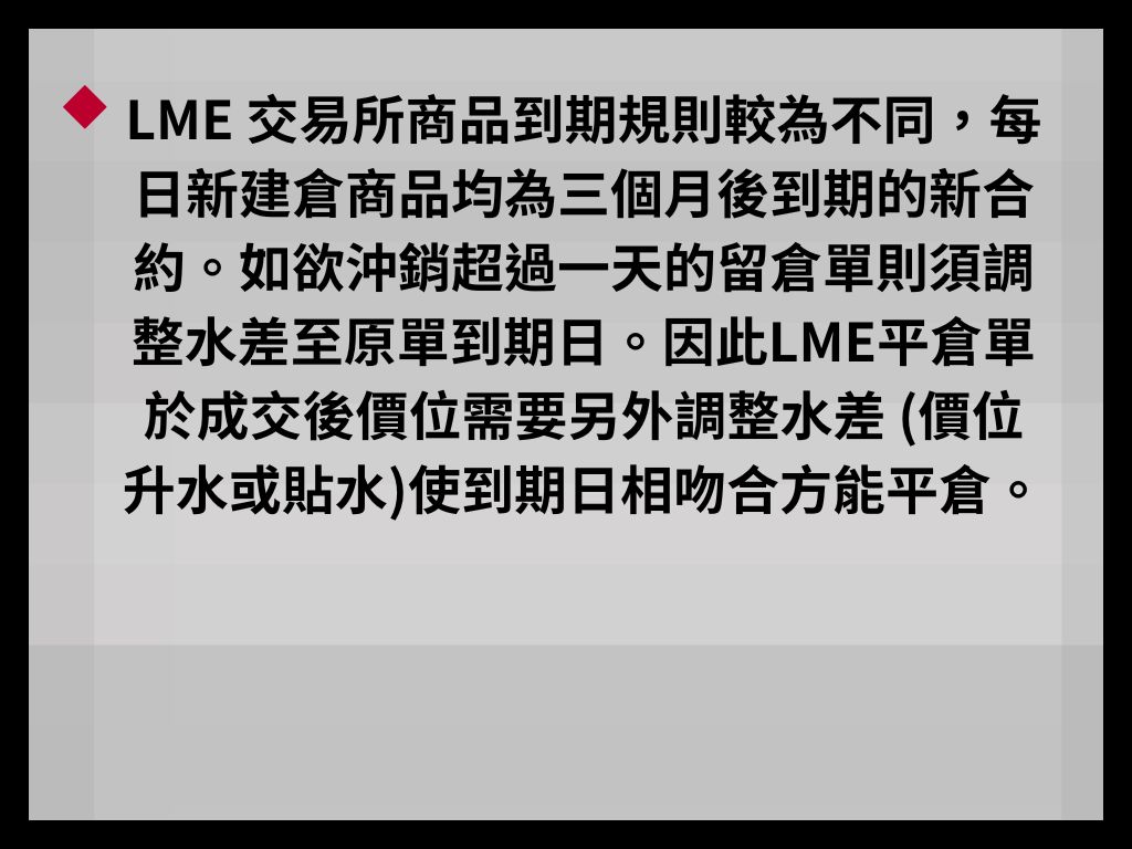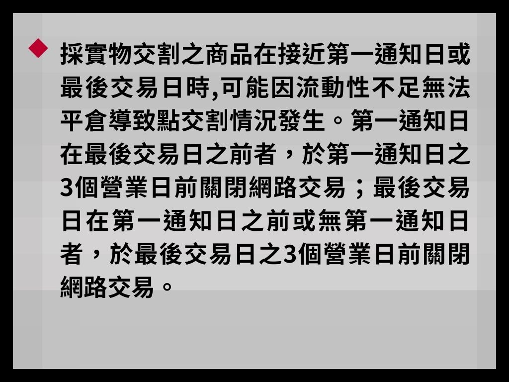 - 最後交易日(LTD):標的月份前第二個月的最後一個營業日之指定結算時段結束(例:3 月合約於1 月最後一個營業日到期)。