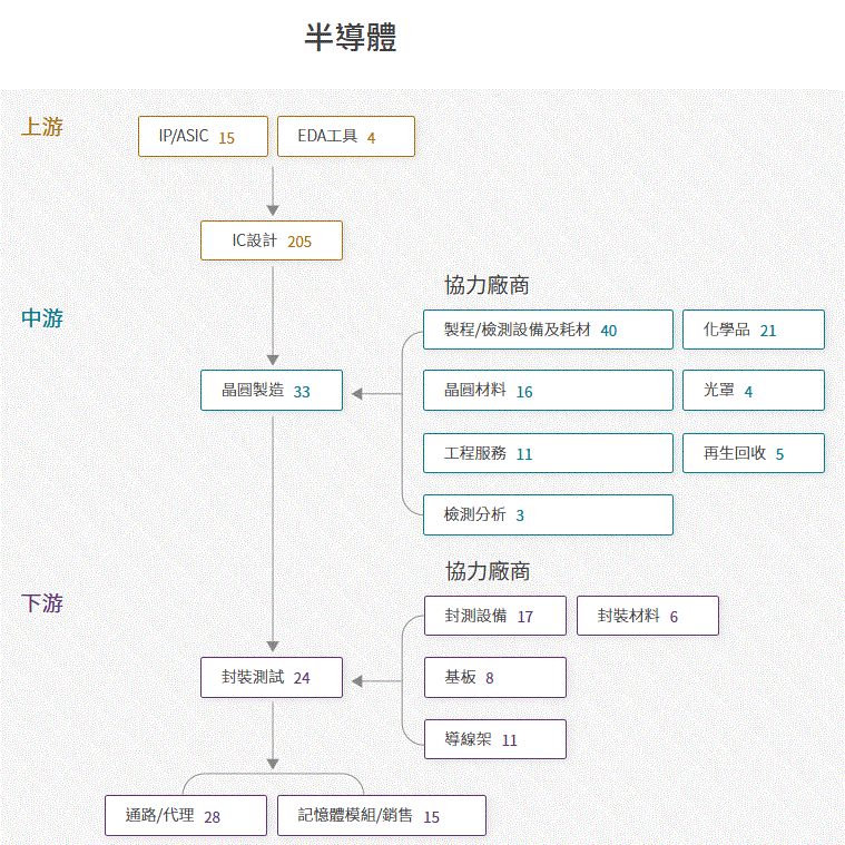 - 中游:晶圓製造、光罩、化學品、檢測設備。