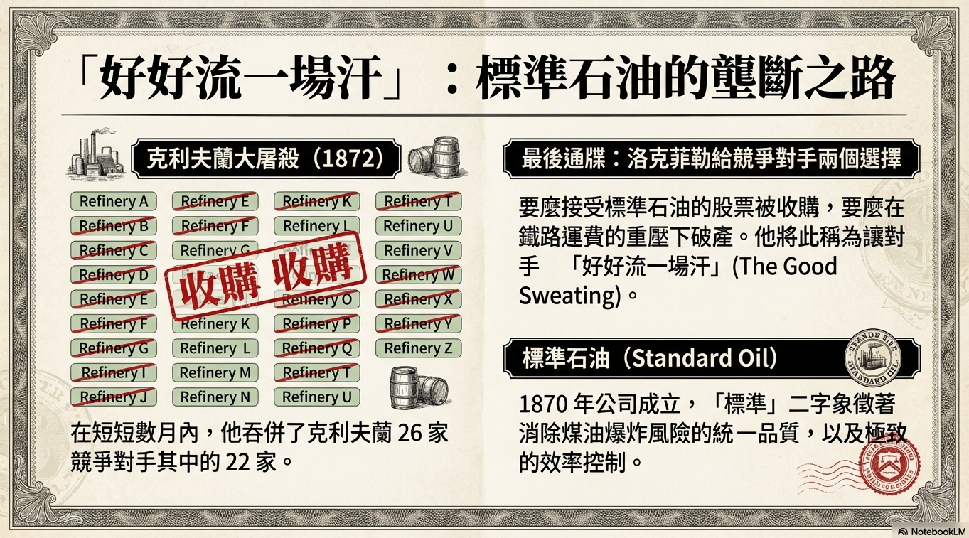 他以鐵路回扣、併購與價格戰,無情清場,最終在 1880 年掌控美國 90% 以上的煉油產能。