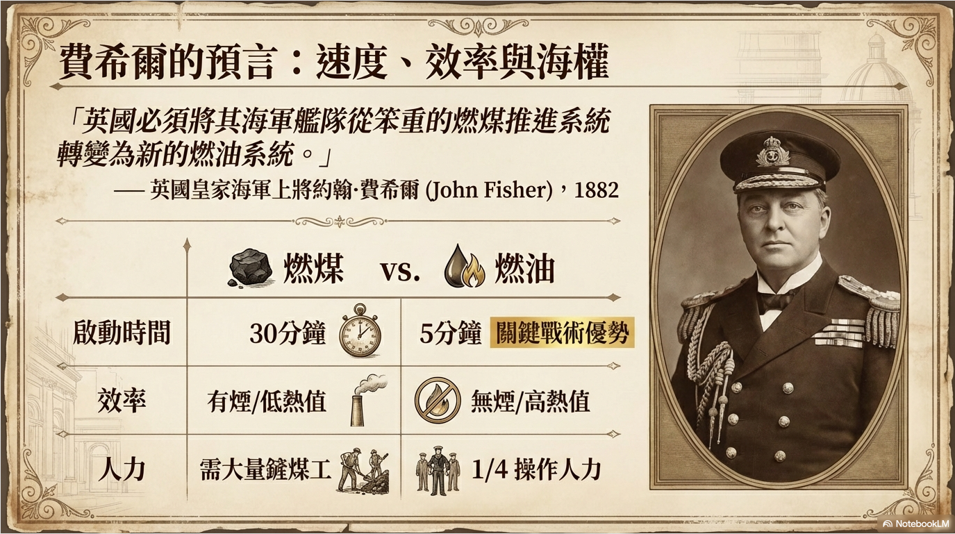 在 19 世紀末,石油仍只是煤油燈的燃料,全球工業與軍事的真正動力,仍然來自煤炭。然而,英國皇家海軍上將John Fisher