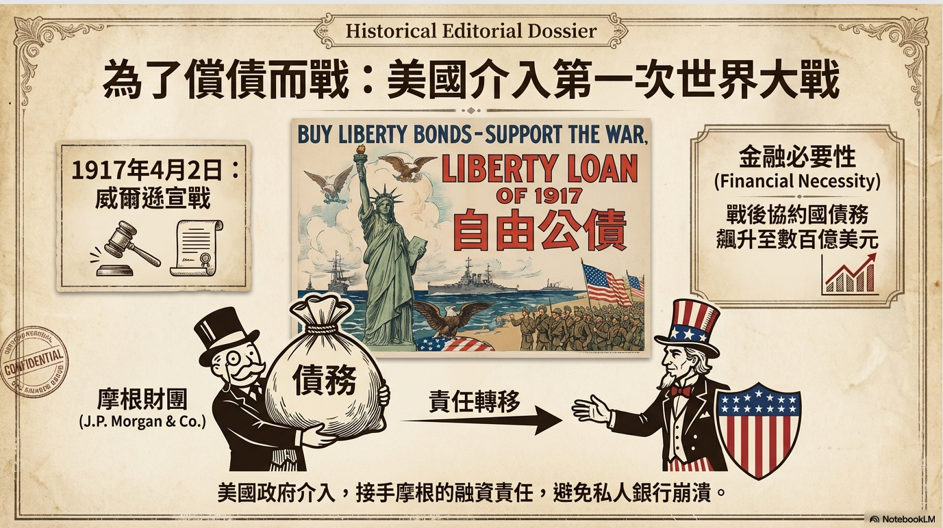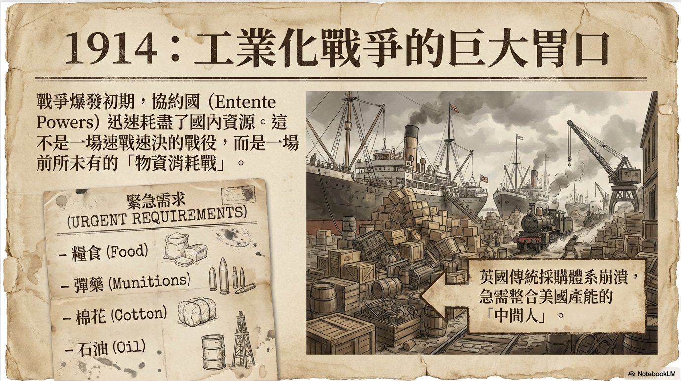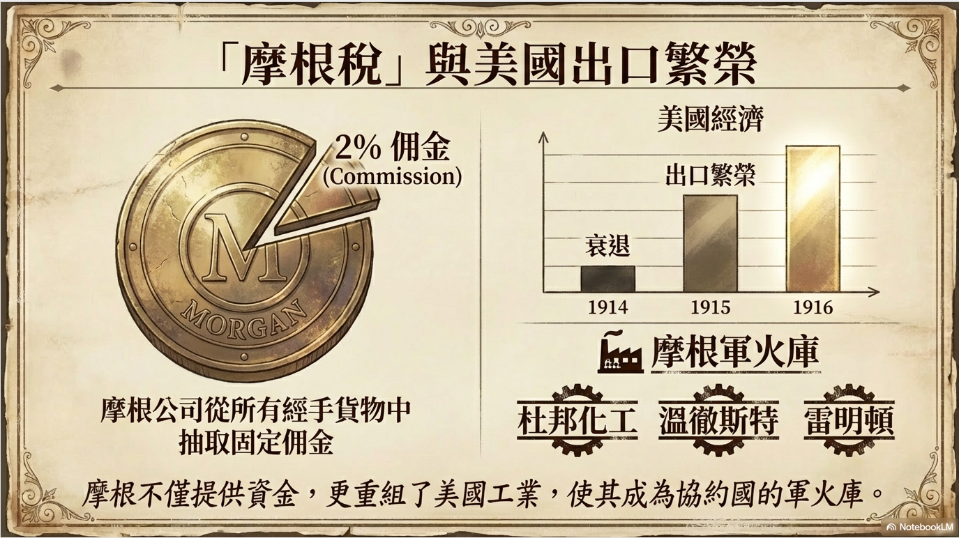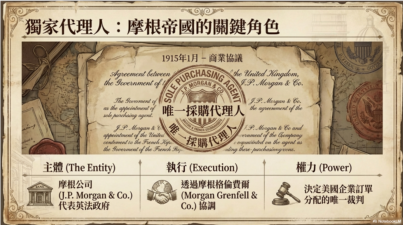 但在第一次世界大戰期間,這件事真的發生了。1915 年,英國政府正式任命J.P. Morgan & Co.為其在美國的獨家採購與融資代理。不久後,法國也透過摩根體系,將軍火採購與戰爭信貸交由同一金融集團處理。這意味著,一家私人銀行,實質上掌控了協約國的工業供應與金融動脈。