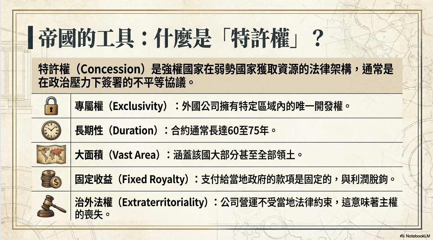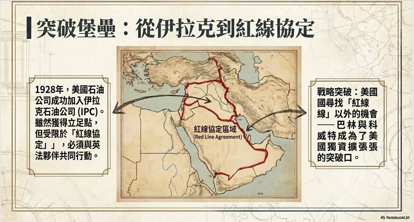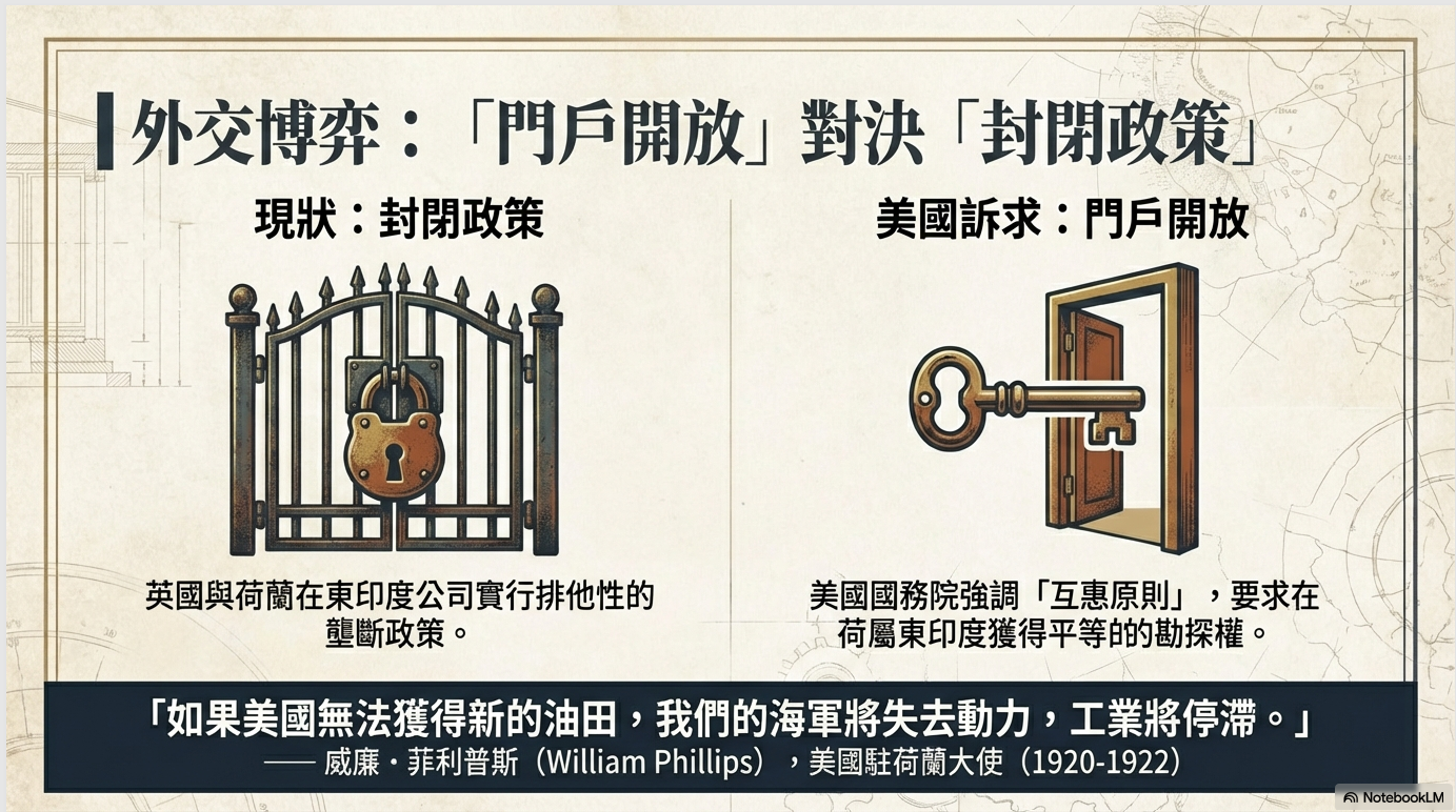 美國高舉「門戶開放」政策,要求公平競爭,但這並非單純的自由貿易主張。當時,全球海外石油資源,主要掌握在英國的 Anglo-Persian Oil Company與 Royal Dutch Shell 手中,合計控制超過一半的原油產量。所謂的門戶開放,本質上是一種打破舊帝國壟斷、強行擠入既有版圖的權力策略。透過「利權(concession)」制度,美國企業取得在主權國家內長期、廣泛的獨占開採權,而地主國僅能分得極低回報。這不是去殖民,而是換一個帝國。