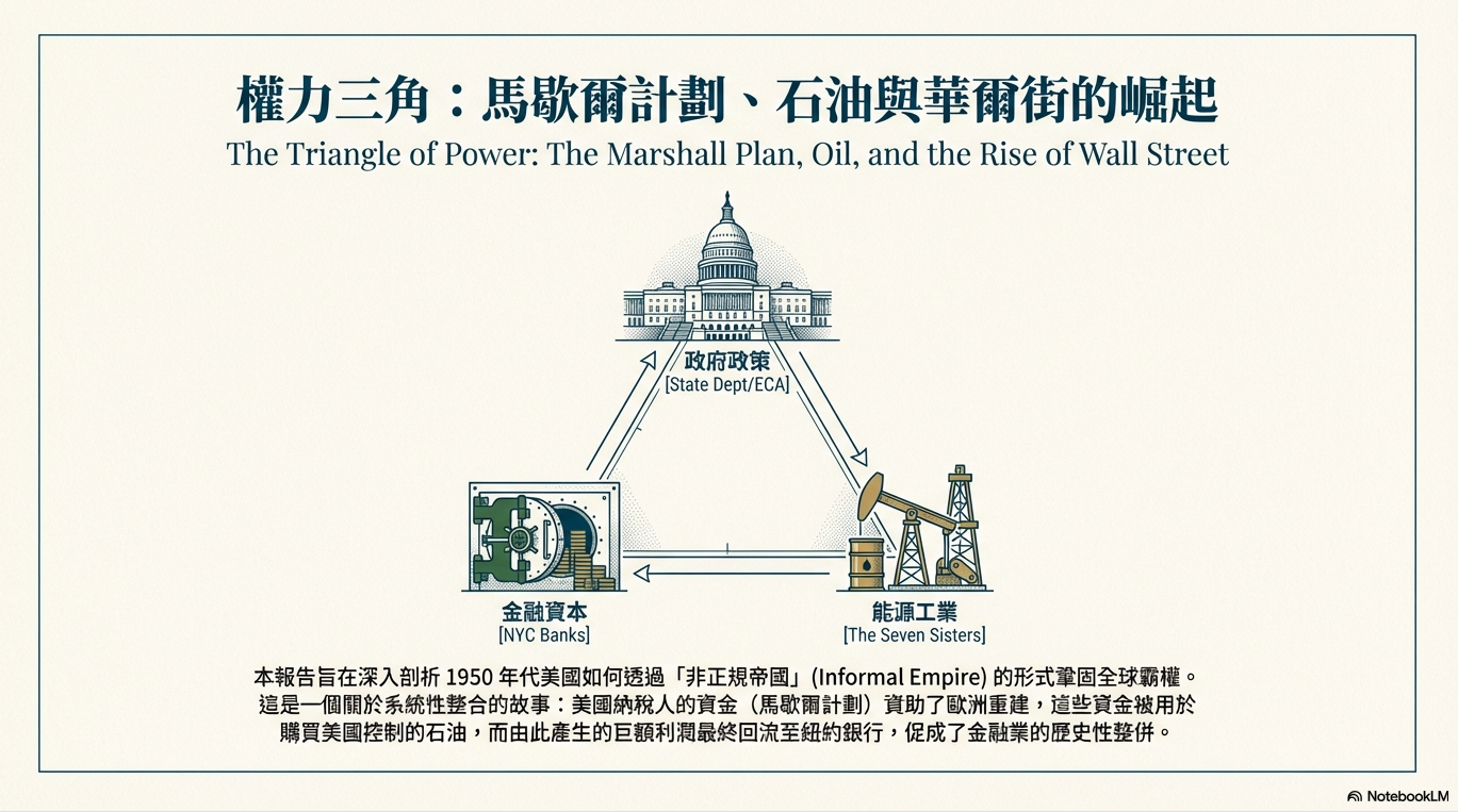 戰後世界的規則,並非單一政府所制定,而是由 美國石油工業、紐約金融銀行體系,以及政府外交政策,所構成的一個高度協調的權力聯盟。這不是陰謀,而是制度化的結構選擇。